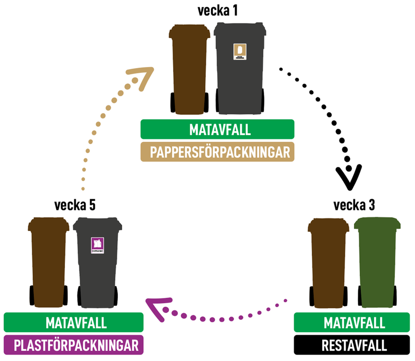 Sopbilen kommer varannan vecka, precis som idag, och tömmer två tunnor åt gången. Vid varje hämtning ställer du ut tunnan för matavfall tillsammans med en av de andra tunnorna. Det innebär att tunnorna för restavfall, pappersförpackningar och plastförpackningar töms var sjätte vecka, enligt ett rullande schema.
