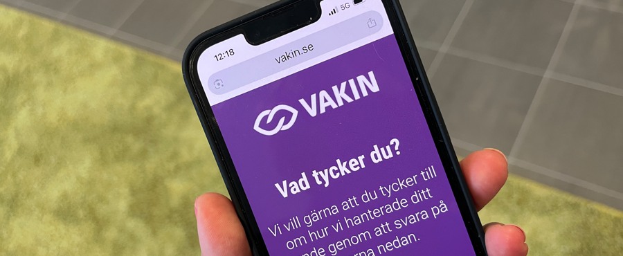 Du som kontaktat Vakins kundservice under perioden får ett sms som leder till ett frågeformulär. Där kan du svara på några korta frågor om hur du upplevt kontakten med oss. Du kan också lämna synpunkter som hjälper oss i vårt förbättringsarbete. Tack för hjälpen!
